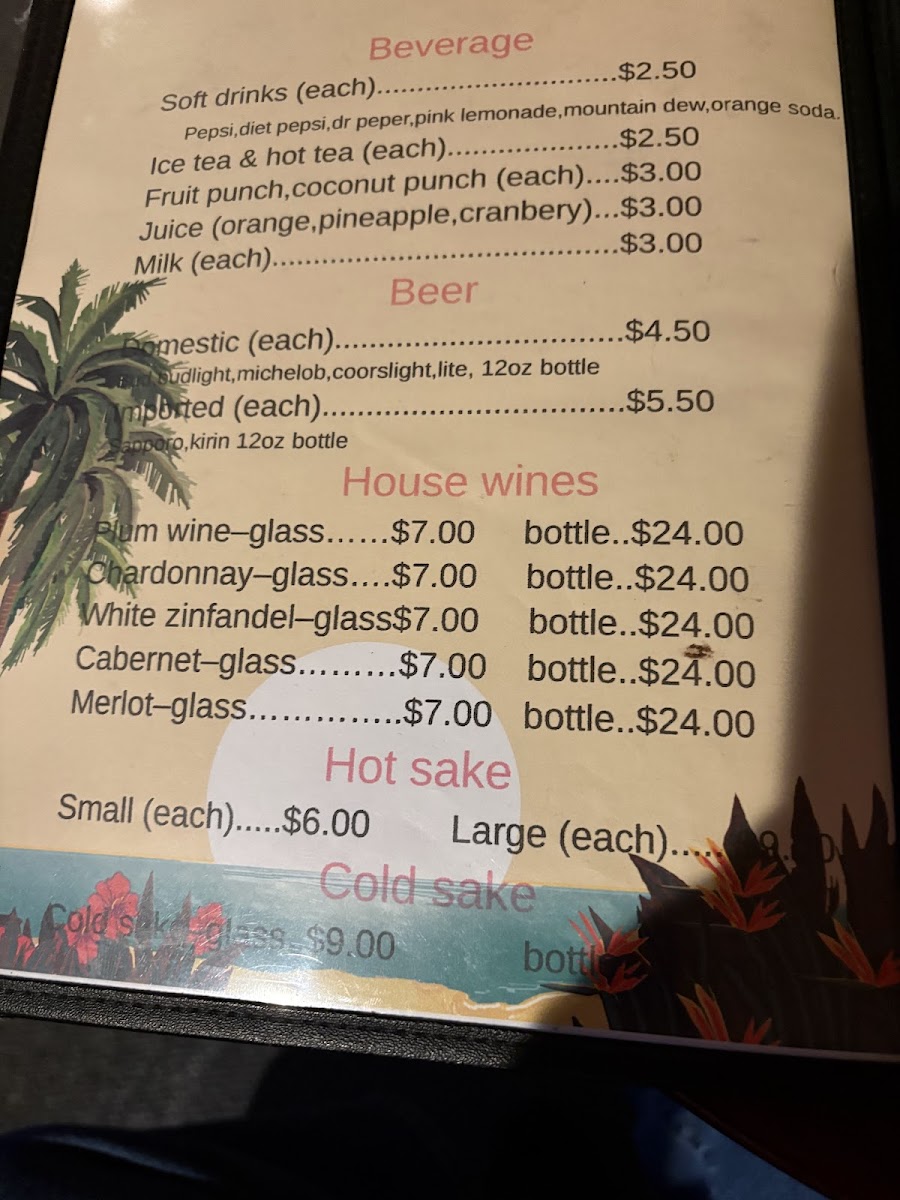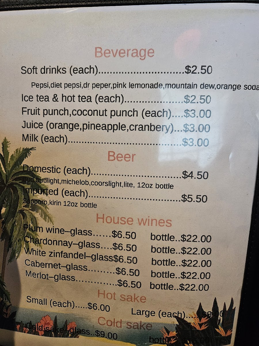 Drinks: The beverage selection features options such as cold sake, and Sapporo beer in multiple sizes. Soft drinks like root beer are also available.