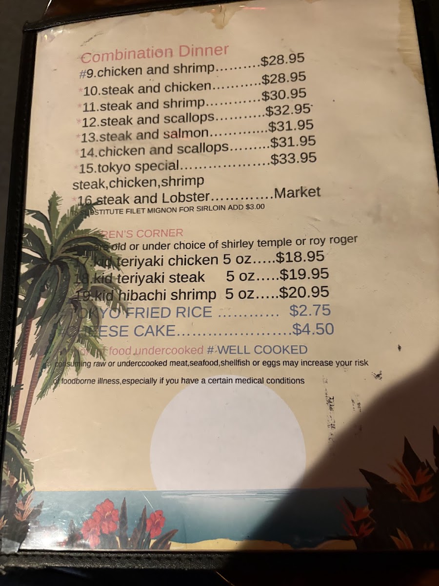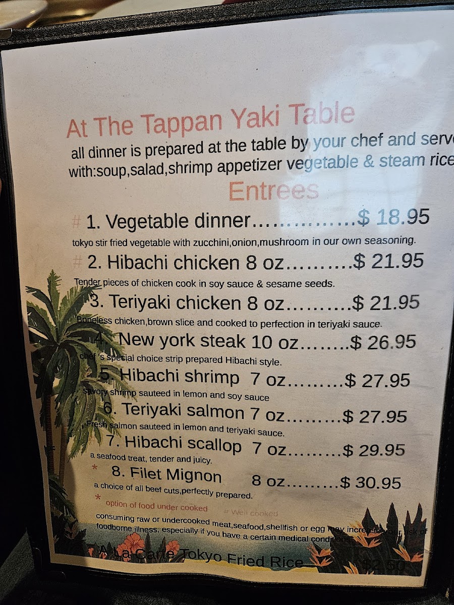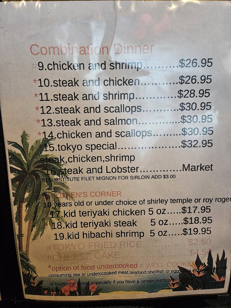 Main Courses and Combination Dinners: This section includes popular items such as steak and shrimp, chicken and scallops, steak and salmon, and the Tokyo Special, which combines steak, chicken, and shrimp. These dishes often come with accompaniments like fried rice, vegetables, and soup.