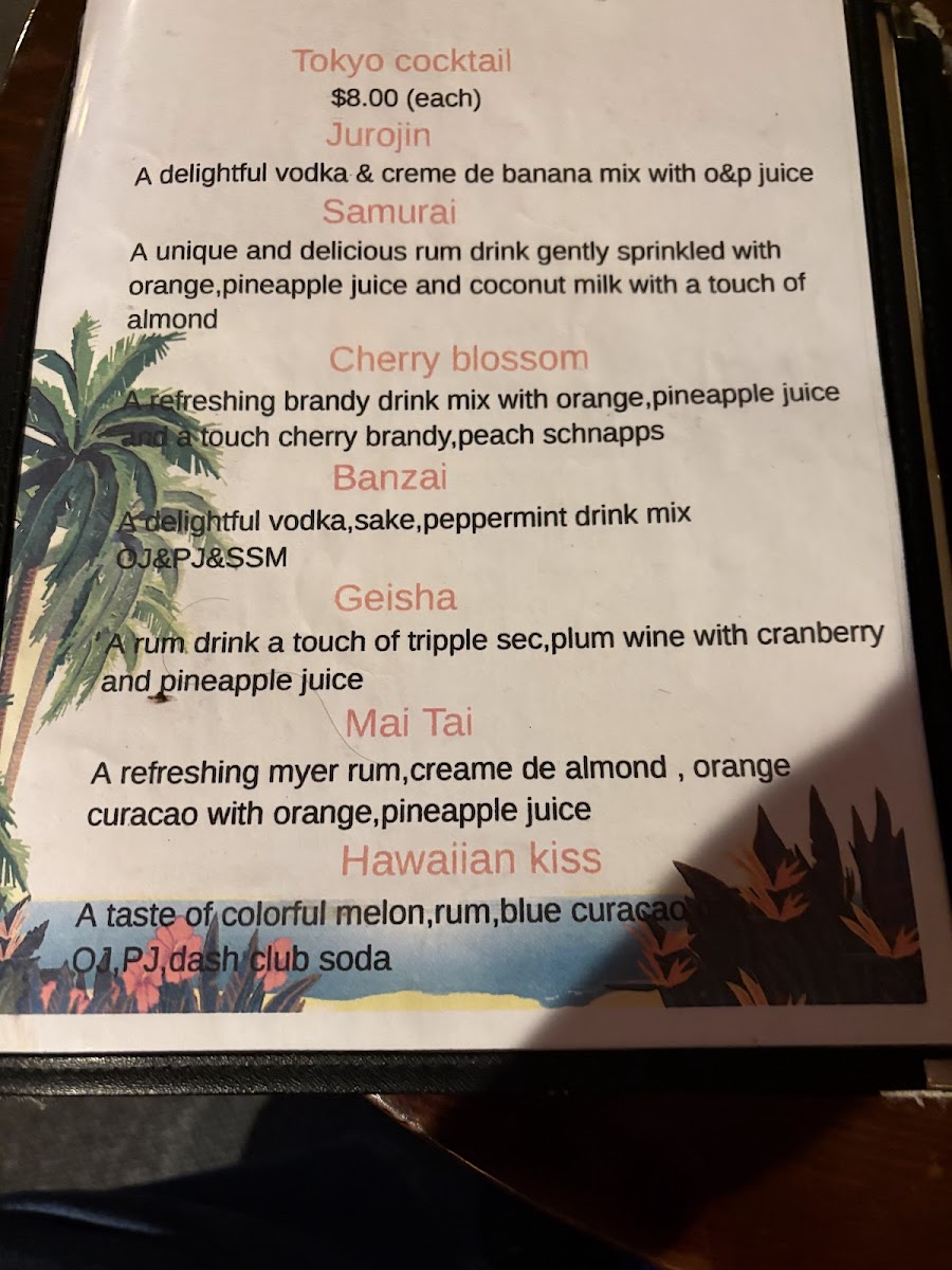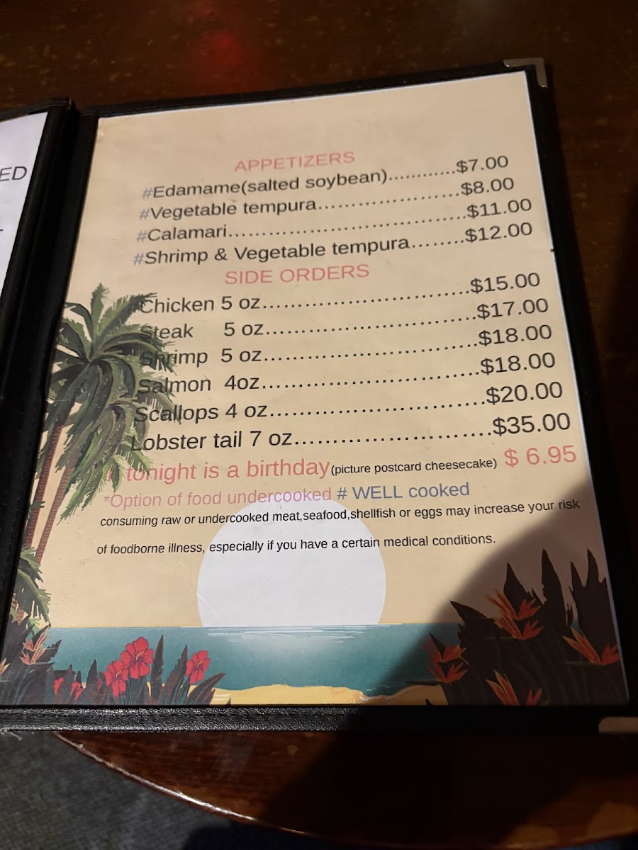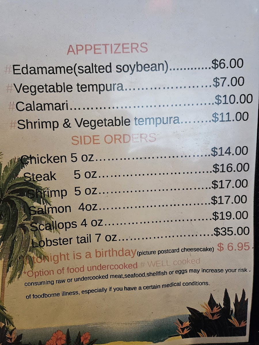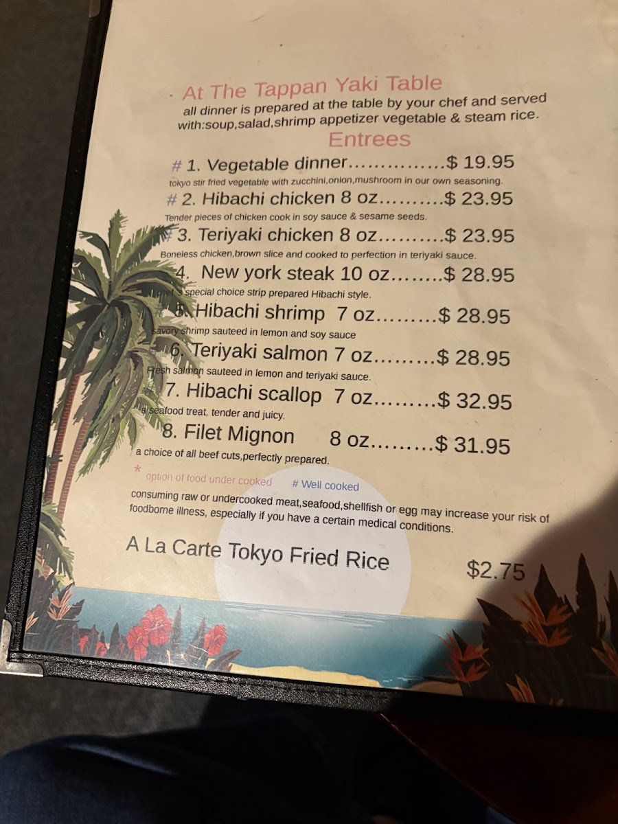 Main Courses and Combination Dinners: This section includes popular items such as steak and shrimp, chicken and scallops, steak and salmon, and the Tokyo Special, which combines steak, chicken, and shrimp. These dishes often come with accompaniments like fried rice, vegetables, and soup.